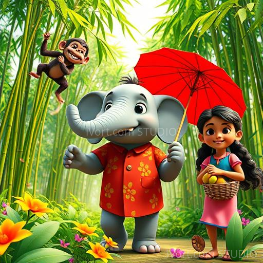 In the lush green forests of India, there lived a gentle elephant named Gaja. One sunny morning, Gaja woke up feeling puzzled. He couldn't remember where he had kept his favorite red umbrella, which he loved to carry during monsoon showers. Gaja's big ears twitched with worry as he looked around his cozy jungle home, filled with colorful flowers, tall bamboo, and chirping birds. He decided to ask his friends for help, feeling a little sad but hopeful to find his special umbrella.