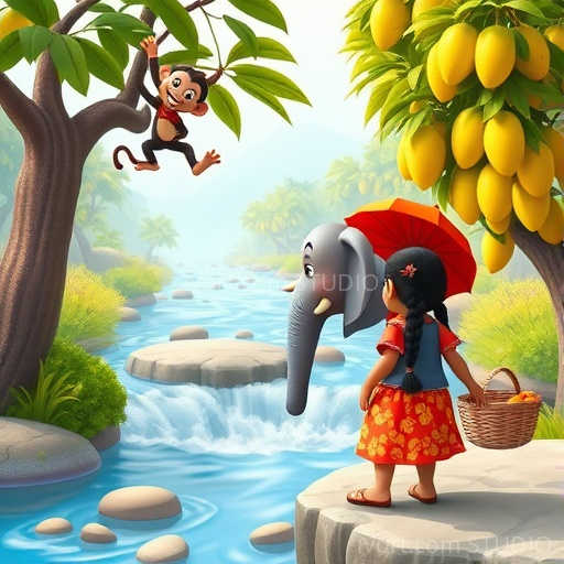 Gaja trotted over to his monkey friend, Momo, who was swinging from a branch. 'Momo, have you seen my red umbrella?' Gaja asked. Momo scratched his head and said, 'Hmm, I saw something red near the river yesterday, but I wasn't sure if it was your umbrella.' Excited and a little nervous, Gaja decided to visit the riverbank, where the water shimmered under the bright sun and children from nearby villages played with colorful boats and kites.