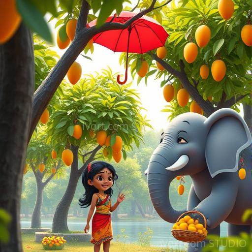 At the river, Gaja looked around carefully. Suddenly, he saw a shiny red object caught in the branches of a tall mango tree. It was his umbrella! But how did it get there? Just then, a little girl from the village named Anjali came running with a basket of mangoes. She smiled and said, 'Gaja, I found this umbrella near the mango grove. I thought it was yours because it has your favorite red color.' Gaja felt happy and grateful. He realized that sometimes, forgetting can lead to new adventures and surprises.