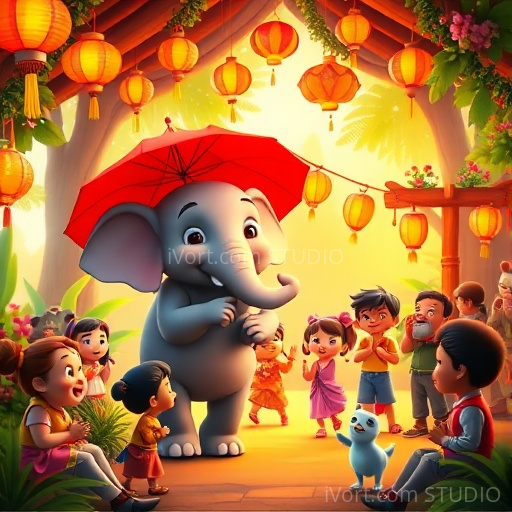 Gaja gently thanked Anjali and promised to remember where he keeps his belongings. He learned that sharing his feelings and asking friends for help makes him stronger. From that day on, Gaja kept his umbrella in a special spot near his cozy jungle home. Whenever it rained, he happily opened his umbrella, feeling grateful for his friends and the beautiful forest around him. The animals and villagers celebrated with a small festival, dancing and singing under the colorful lights, reminding everyone that friendship and memory are treasures to cherish.