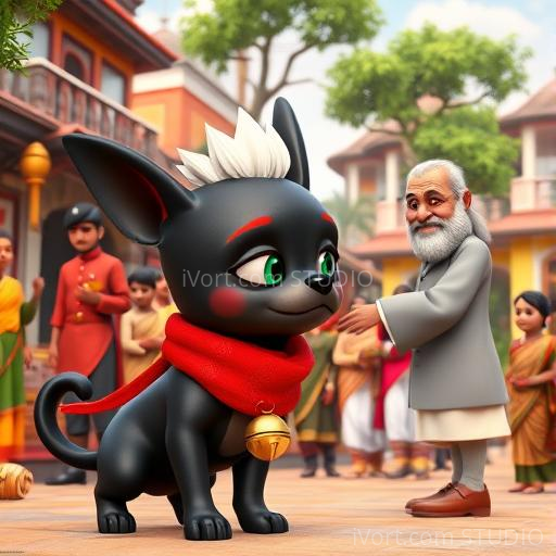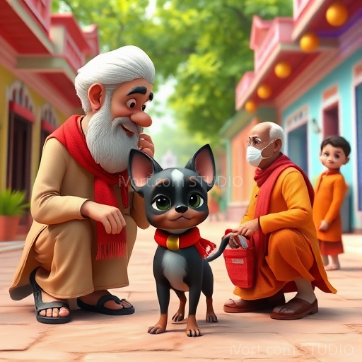 In a lively Indian village nestled between lush green fields and colorful houses, there was a tiny but mischievous chihuahua named Rocco. Rocco had shiny black fur, bright eyes, and a tiny crown of white fur on his head that made him look like a little king. But Rocco was not a kind king—he loved to cause trouble, especially for the friendly mailmen who delivered letters and sweets to the villagers. One sunny morning, as the mailmen approached the village gate, Rocco decided it was time for his mischief to begin. He barked loudly and ran toward them, showing his tiny teeth and wagging his tail in a mischievous way, ready to surprise them.