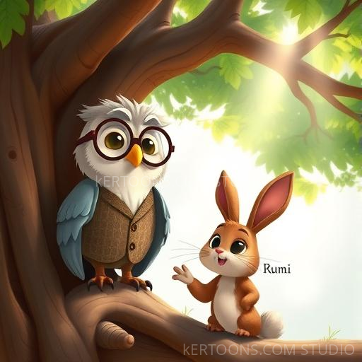 However, not everyone appreciated Rumi's constant chatter. The wise old owl, Ollie, watched from a nearby tree, shaking his head disapprovingly. 'That rabbit never stops talking,' Ollie muttered to himself, adjusting his spectacles.