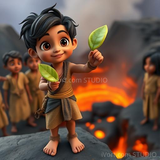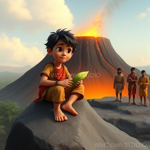 Just as Raju was about to lose hope, a gentle breeze swept through the village, carrying the leaf away from the volcano. Miraculously, it landed softly in Raju’s hand. Suddenly, he felt a strange warmth spreading through him, not from the leaf, but from within. With newfound courage, Raju pulled himself back from the edge, climbing onto a sturdy rock. The villagers, still watching silently, seemed to notice him for the first time—perhaps because they saw a spark of something different in his eyes.