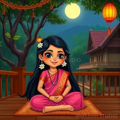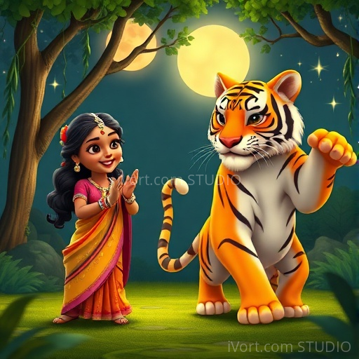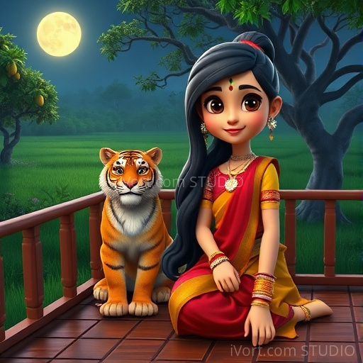 In a small Indian village nestled between lush green fields and towering mango trees, young Rani gazed up at the glowing moon. She loved the moon’s gentle light, but tonight, she felt a strange thrill—she had heard stories of a majestic tiger that roamed the nearby jungle under the moon’s watchful eye. Curious and a little nervous, Rani decided to stay awake and see if she could spot the tiger herself. As she sat quietly on her veranda, the moon cast silvery shadows, and the jungle whispered secrets in the breeze.