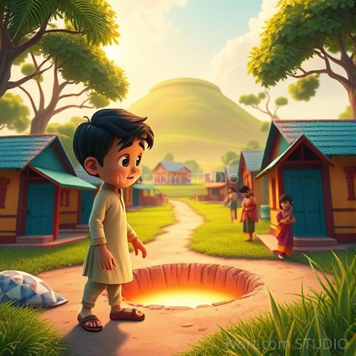 In a small Indian village surrounded by lush green fields and colorful houses, a curious boy named Arjun loved exploring. One sunny morning, he wandered near the edge of a mysterious hill, where he noticed a strange, glowing crack in the ground. His eyes sparkled with wonder, but no one in the village paid him much mind—everyone seemed busy with their daily chores, and kindness was scarce. Driven by curiosity, Arjun tiptoed closer, unaware of the danger lurking beneath. Suddenly, the ground trembled, and he slipped, tumbling into a hidden pit of glowing lava. The villagers, busy with their routines, saw him fall but did not rush to help. Arjun felt scared and alone, realizing that in this world, bravery and kindness seemed to have vanished.