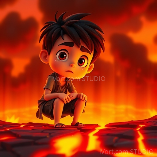 Arjun sank into the fiery glow of the lava pit, his heart pounding. The heat was intense, and he felt a wave of fear and sadness. No one was around to hear his calls for help. The villagers continued their routines, ignoring the boy’s plight. Arjun looked up at the dark, cloudy sky, wishing someone would notice and help him. But in this world, kindness seemed to have disappeared, and bravery was a forgotten word. As he sat trembling, he wondered if anyone cared—if anyone would come to save him or if he was destined to be forgotten forever.
