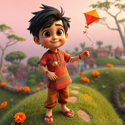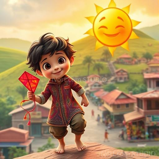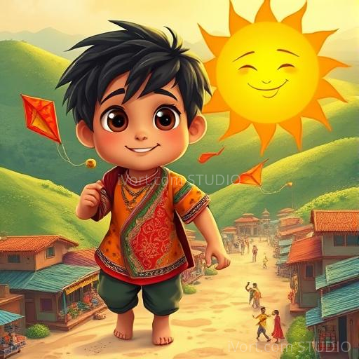 In a colorful Indian village nestled between lush green hills and vibrant markets, young Aarav gazed up at the sky with wide, curious eyes. The sun shone brightly, casting golden rays over the bustling streets filled with spice stalls and cheerful children playing. Aarav wondered, 'What if I could borrow the sun just for a little while?' His heart fluttered with excitement and a tiny spark of mischief as he decided to find a way to bring the sun closer, dreaming of adventures and magic.