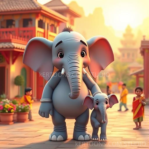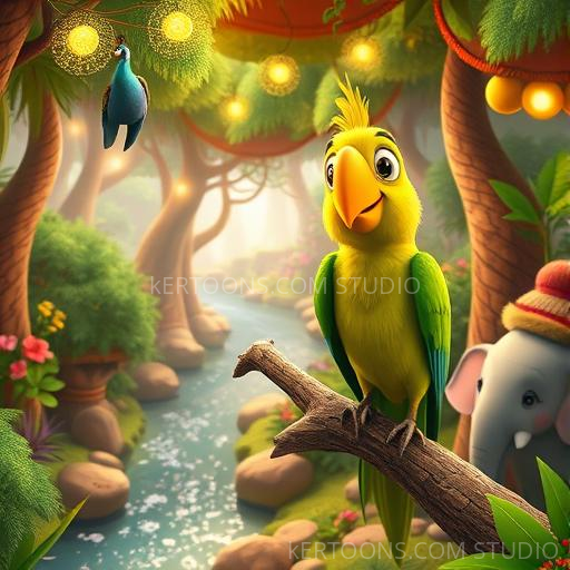 Chintu’s tiny elephant friend led him into a lush, enchanted jungle filled with towering mango trees, shimmering peacocks, and glowing fireflies. The jungle was alive with the sounds of chirping birds and rustling leaves. As they wandered deeper, they found a sparkling river where colorful fish danced beneath the water’s surface. Suddenly, a wise old parrot with bright green feathers and a golden beak perched on a branch called out, 'To find the greatest treasure, you must believe in your imagination!' Chintu and his elephant friend nodded eagerly, feeling a warm glow of hope and curiosity. The jungle was mysterious but friendly, promising them a new adventure at every turn.