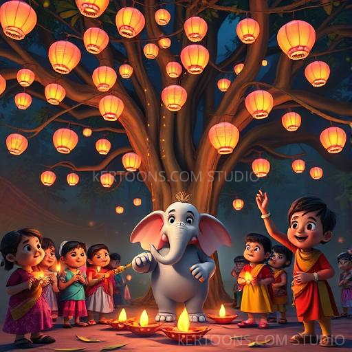 As night fell, the jungle transformed into a dazzling festival of shimmering lanterns and glowing diyas, inspired by Diwali, India’s Festival of Lights. Chintu’s magic pencil and his elephant friend helped decorate the trees with tiny lights, filling the air with joy and warmth. Children from nearby villages arrived, their faces lit with happiness, joining in the celebration. The wise parrot announced, 'The greatest treasure is friendship and believing in your dreams!' Everyone cheered, releasing floating lanterns into the sky that shimmered like stars. Chintu realized that his true magic was sharing happiness and kindness, and he felt grateful for the adventure that had brought everyone together.