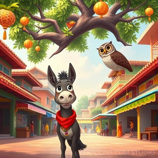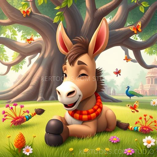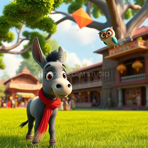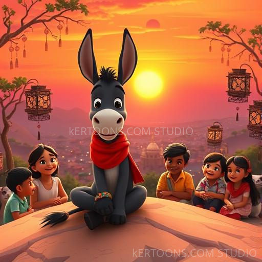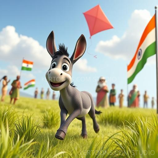 In a lively Indian village nestled between lush green fields and colorful markets, lived a small donkey named Gopal. Gopal had big, curious eyes and a gentle heart. Every day, he watched the birds soaring high above the mango trees, and he wondered what it would feel like to fly. Though the other animals laughed and said donkeys couldn't fly, Gopal’s dream stayed bright in his heart. One sunny morning, Gopal decided to find a way to lift himself into the sky and chase his dream of flying, filling the village with hope and wonder.