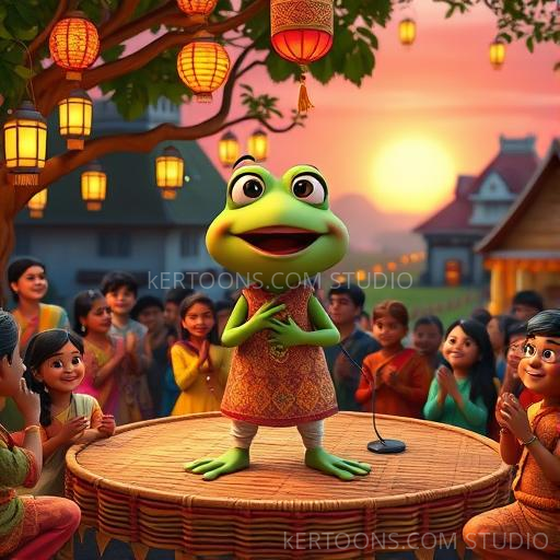 One evening, as the sun dipped behind the hills, the villagers gathered around the pond for a special festival. Raga, nervous but excited, decided it was time to share his singing. He took a deep breath and began to croon a melody inspired by the soulful tunes of Indian classical music. His voice echoed through the trees, filling the air with magic. The villagers, including children in colorful saris and dhotis, listened in awe as Raga’s voice soared like a soaring kite in the sky. Even the wise old turtle nodded happily, and the fireflies danced around him like tiny stars. When Raga finished, everyone cheered and clapped, realizing that dreams can come true when you believe in yourself. Raga felt proud and happy, knowing he had brought joy to his village.