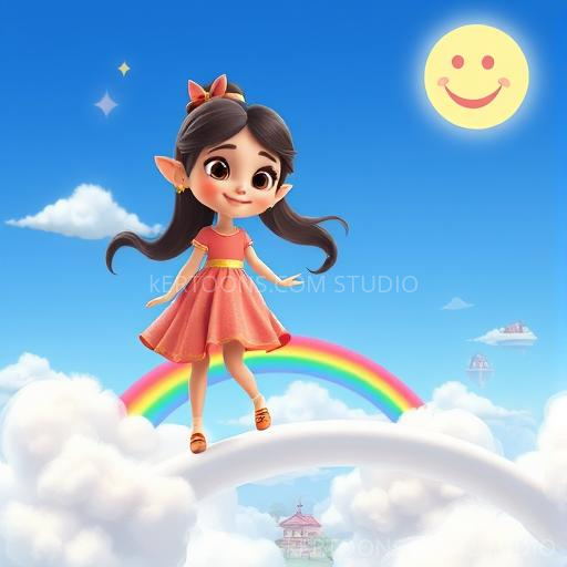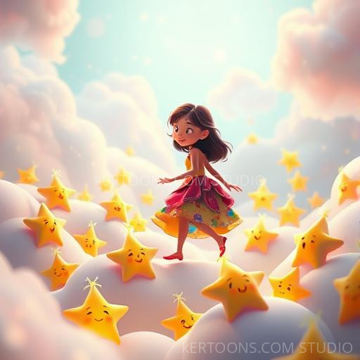 The next morning, Mira woke up with a sparkle in her eyes. She decided to build a magical bridge made of fluffy clouds to reach the Sky Garden. With her tiny hands, she gathered soft, cottony clouds from the sky, which shimmered with hues of pink and gold. As she stepped onto her cloud bridge, it wobbled playfully, but Mira giggled and tiptoed forward. Up, up she went, passing through a rainbow-colored tunnel, feeling the gentle tickle of the wind and the warm sunlight on her face. Soon, she was floating among the clouds, closer to the stars’ resting place.