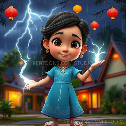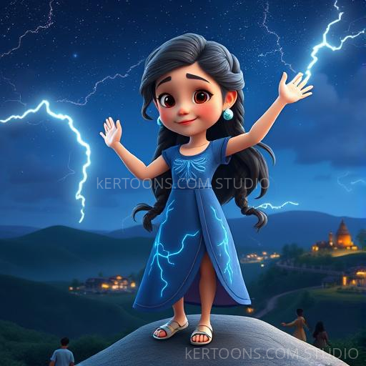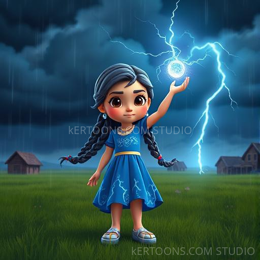 Lila practiced her new lightning powers, making tiny sparks dance around her like fireflies. But one day, dark clouds gathered over her village, and a fierce storm threatened to flood the fields. Lila hesitated—she was scared she might cause harm. Remembering her kind heart, she took a deep breath and decided to use her gift to help. With a mighty flick, she summoned a gentle lightning that turned into a protective shield, calming the storm and guiding the rain away from her friends. Lila realized that her courage and kindness could turn fear into hope, making her a true hero of her village.
