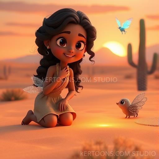 As Amina ventures further, the whispering sound grows clearer, like a gentle lullaby. Suddenly, she spots a tiny, shimmering creature—a desert sprite named Zari—dancing among the cactus shadows. Zari giggles and invites Amina to listen closely. 'The desert whispers stories of old,' Zari explains, 'if you listen with your heart, you'll hear the magic of kindness and courage echoing in the wind.' Amina feels a warm glow inside, realizing that listening can reveal wonderful secrets.