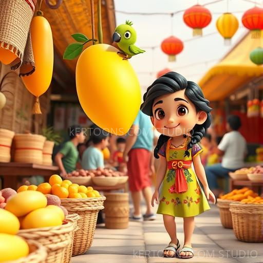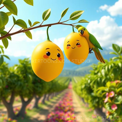 In a lush tropical orchard, a bright yellow mango named Momo hung happily from a tree branch. One sunny morning, Momo suddenly heard a tiny voice whisper, 'Hello!' Startled but curious, Momo realized he could talk! Excited and a little nervous, he wondered what adventures awaited him if he could speak to everyone around him. As the breeze swayed the leaves, Momo decided to share his secret with his best friend, a cheerful parrot named Pico.