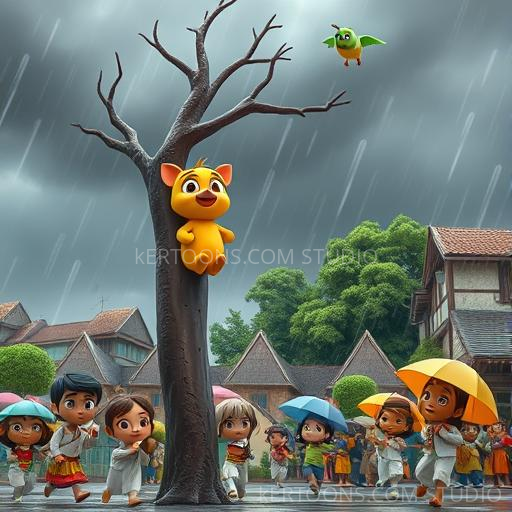 One day, a strong wind threatened to shake the trees and scatter the fruits. Momo felt worried for his friends and the villagers. With his new voice and courage, he called out to everyone, warning them of the coming storm. The villagers listened carefully, and together they quickly took shelter. Momo realized that talking and sharing could help protect everyone. He felt proud and brave, knowing his voice made a difference. From that day, Momo understood that being brave means helping others when they need you most.
