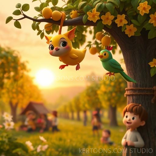 After the storm, the orchard was quiet and peaceful again. Momo looked around and saw how everyone had helped each other. He realized that his ability to talk was a special gift—one that could bring kindness, courage, and joy. Momo decided to share his voice every day, telling stories and helping friends. As the sun set, casting a golden glow, Momo felt happy inside, knowing that even a small mango could make a big difference. And from that day on, he shined brighter than ever, inspiring everyone to be brave and kind.