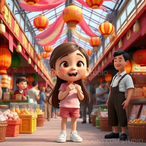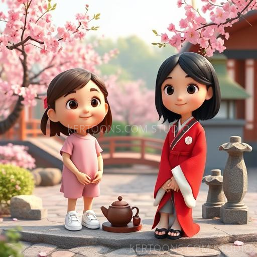Next, Lily's swirl of colors brought her to a peaceful Japanese garden, where cherry blossoms floated softly in the breeze. She sat with a kind girl named Emi, who offered her a warm cup of matcha tea. They shared stories of their favorite flowers and dreams. Lily felt a gentle warmth in her heart, realizing that friendship is a special kind of magic that crosses borders and languages. As the cherry blossoms danced around her, she knew that kindness and curiosity could connect everyone, no matter where they come from.