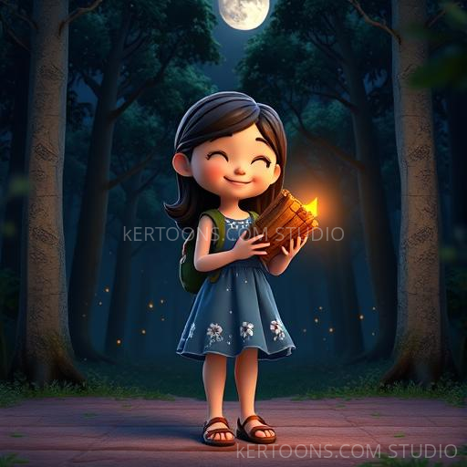 Luna and her glowing friends journey back through the woods, guided by the firewood’s gentle light. Along the way, they encounter friendly animals and shimmering streams, all part of the magical forest. Luna feels proud and joyful, knowing she’s helping her friends find their way home. As they reach the edge of the forest, the firewood’s glow dims happily, and they thank Luna with a sparkle in their flames. Luna waves goodbye, feeling grateful and inspired, knowing that kindness and bravery can light up the darkest nights.