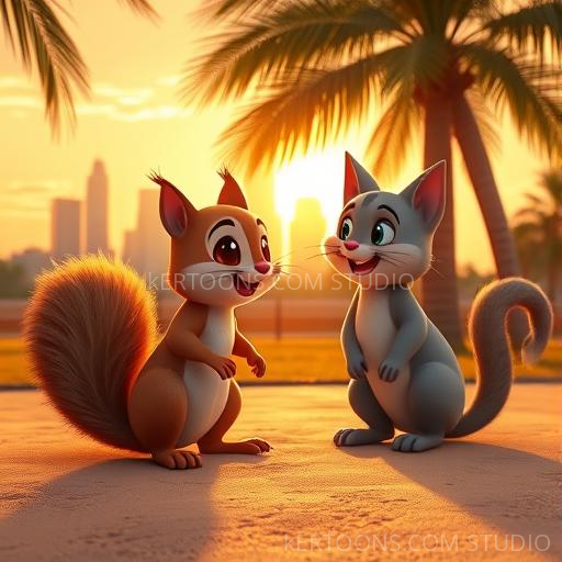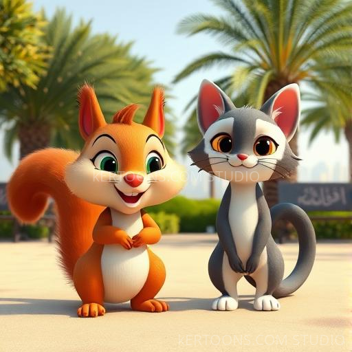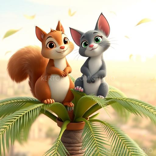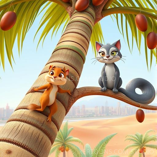 One sunny morning in Dubai, Squeaky the squirrel and Whiskers the cat wandered through a bustling park. Squeaky’s tiny paws tapped excitedly on the warm sand as he spotted a tall, lush palm tree swaying gently in the breeze. 'Wow! Look at that giant tree!' Squeaky squeaked. Whiskers purred softly, feeling curious too. They wondered what secrets the palm tree might hold, and with a shared giggle, they decided to explore together. Their friendship grew stronger as they prepared for a little adventure under the bright, sunny sky.