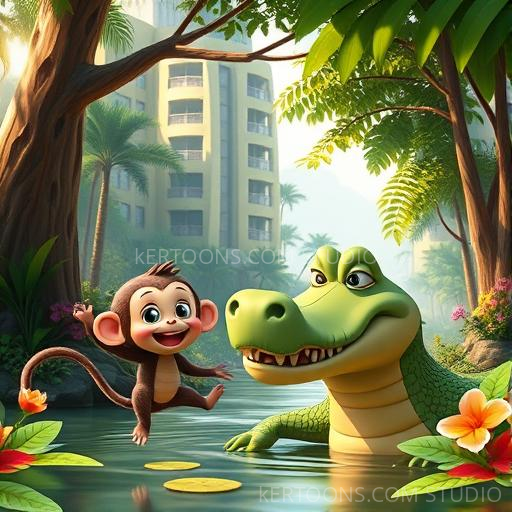 In the lush, green jungle by a shimmering river, Monkey loved to swing from tree to tree, singing cheerful songs. One sunny morning, he noticed a curious crocodile peeking out from the water, eyeing him with a gentle smile. The crocodile wanted to be friends, but Monkey was a little nervous. As they exchanged greetings, Monkey wondered if he could trust this strange new friend. The jungle buzzed softly around them, filled with the scent of blooming flowers and the rustling leaves, reminding Monkey that friendship often begins with a little courage. The moral: Trust is built with kindness and a brave heart.
