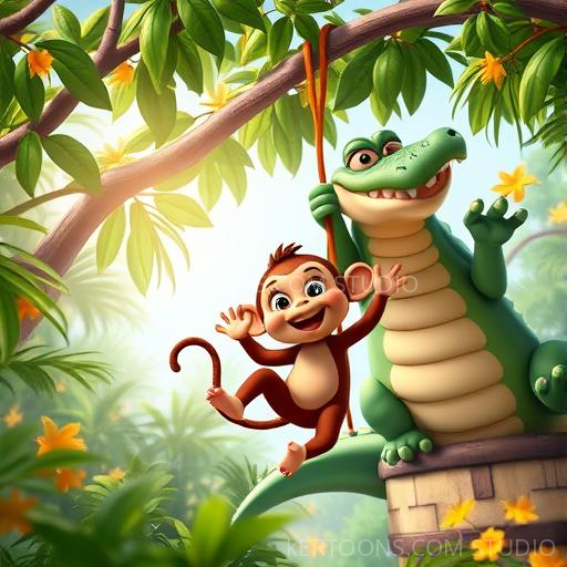 Monkey was feeling adventurous and wanted to show Crocodile his favorite swinging spot high in the trees. Crocodile hesitated, worried about falling, but Monkey cheerfully encouraged him to try. With a little help, Crocodile clumsily clambered onto a sturdy branch, giggling as he wobbled. They both laughed, realizing that trying new things could be fun, especially with a friend by your side. The jungle echoed with their joyful shouts, and Monkey felt proud to share his world. The moral: Courage and friendship help us discover new joys.