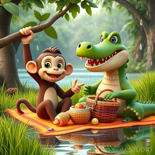 One afternoon, Monkey gathered colorful fruits and nuts, and Crocodile brought fresh river fish. They decided to have a picnic by the riverbank, sharing their treats with each other. As they ate, they told stories of their jungle adventures, feeling warm and happy inside. Suddenly, a gentle rain began to fall, but instead of running away, they danced and splashed in the puddles, giggling with delight. The jungle around them shimmered with raindrops, and they realized that sharing moments, rain or shine, makes friendship stronger. The moral: Joy is doubled when shared with friends, no matter the weather.