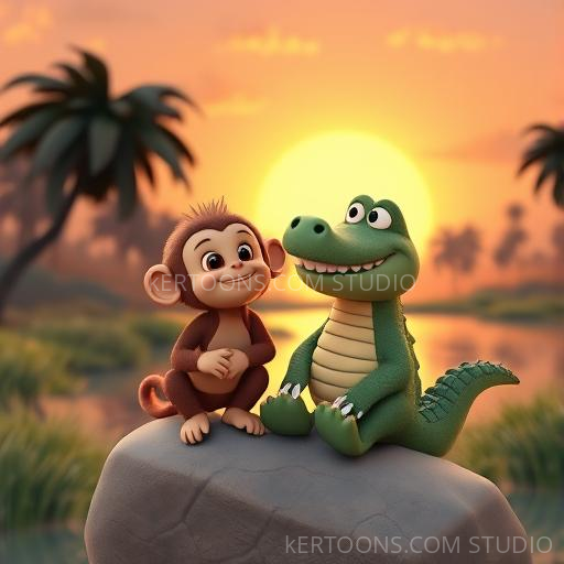 As the sun set over the jungle, Monkey and Crocodile sat together, watching the sky turn pink and orange. Monkey shared a story about how trust and kindness are the true treasures of friendship. Crocodile nodded, feeling grateful for his new friend. They promised to always help each other and stay brave, no matter what adventures lay ahead. The jungle whispered softly around them, reminding everyone that true friends are those who stand by you through thick and thin. The moral: Friendship is a precious gift that grows with kindness, courage, and trust.