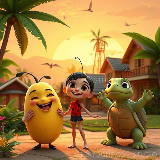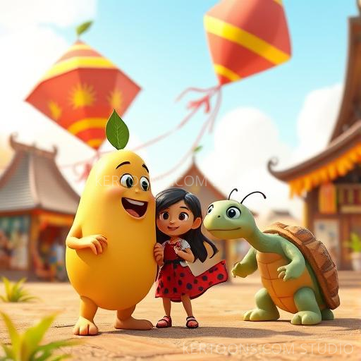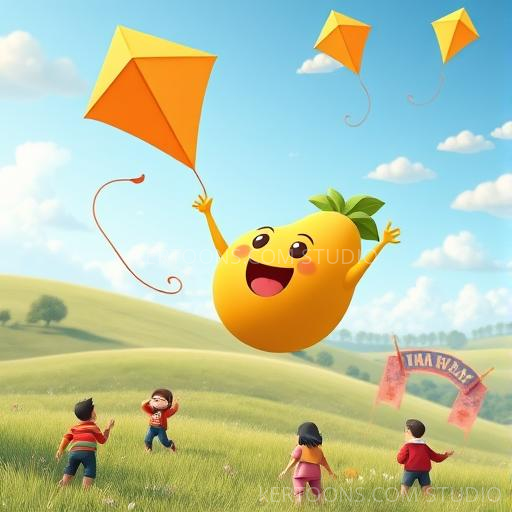 One afternoon, Momo gathered his courage and shared his dream with his friends—Lina the ladybug and Tiko the tiny turtle. Lina giggled, 'Momo, mangoes don’t fly!' But Tiko nodded kindly, 'Maybe we can help you try!' Inspired by his friends’ kindness, Momo thought of a clever plan. He remembered a big, colorful kite from the village festival. Maybe, just maybe, if they worked together, they could make Momo fly! With excitement bubbling inside, Momo felt a warm glow of friendship and hope. He knew that with a little imagination and teamwork, anything was possible.