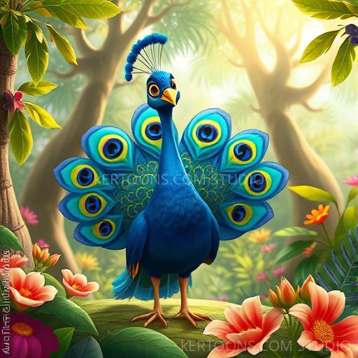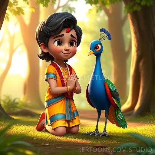 In a lush, vibrant forest near Vrindavan, Priya the peacock loved to spread her colorful feathers. She admired the bright hues of her tail and dreamed of shining even brighter. But sometimes, she felt her feathers weren't enough, especially when she saw Krishna's gentle smile and the sparkling dewdrops on leaves. Priya wondered if her true beauty was only skin-deep, and her heart longed to find her special sparkle.