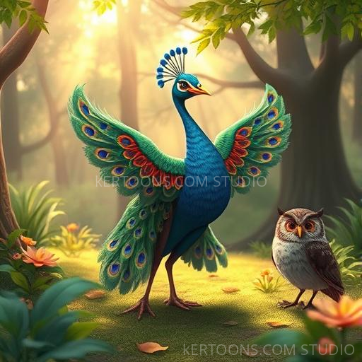 Inspired by Krishna's words, Priya decided to try and shine brighter. She danced in the sunlight, her feathers shimmering a little, but not as much as she hoped. She then asked the wise old owl for advice. The owl hooted softly and said, 'Inner beauty is what truly matters. Shine with kindness and love, and your light will glow from within.' Feeling a bit discouraged, Priya almost gave up, but she remembered Krishna's gentle voice and decided to keep trying with a joyful heart.