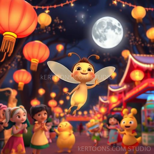 Lali’s glow caught everyone’s attention. Her light flickered and shimmered, adding a magical sparkle to the night sky. The other creatures cheered and clapped, amazed by her bravery. As the parade began, Lali floated happily, her heart bursting with pride. Her unique glow made the night more beautiful, and she realized that her true shine came from her confidence and kindness. She danced and twirled, feeling proud of her special light, knowing she had found her place in the celebration.