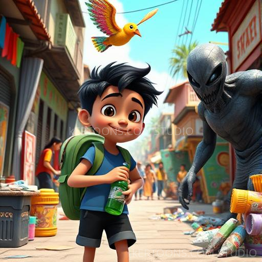 Suddenly, a sneaky figure called Mr. Greedy Trash appeared, spreading more rubbish everywhere, trying to stop Raju. But Raju remembered a story about recycling and turning trash into art. With a spark of creativity, he gathered old bottles, colorful paper, and broken toys. Together with his friends and Babli, they transformed the trash into beautiful, sparkling sculptures that shimmered in the sunlight, inspiring everyone around.