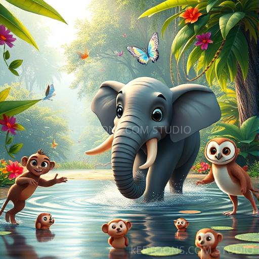 In a lush, colorful jungle bursting with blooming flowers and towering trees, Eka the Elephant loved to splash in the sparkling river and chase butterflies with his friends. His big, cheerful eyes sparkled with excitement as he played under the warm sun, filling the air with joyful trumpets. But sometimes, when things didn’t go his way, Eka’s big feet stomped loudly, and his trumpet turned into a loud roar, scaring his friends away. Despite the fun, Eka’s friends wished he could stay calm and share his happiness peacefully.