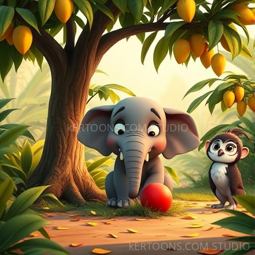 One sunny afternoon, Eka was playing with his favorite bright red ball when suddenly, it rolled into a bush and got stuck. Eka tried to grab it, but it wouldn’t budge. Frustrated, he stomped his feet and trumpeted loudly, feeling his anger bubbling over. When he finally lost his grip, he kicked the ball away and stomped off, feeling upset and lonely. His friends watched sadly, wishing Eka could find a way to stay happy even when things went wrong. Eka sat alone under a big mango tree, worried he’d never be cheerful again.