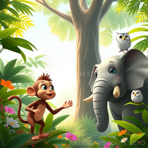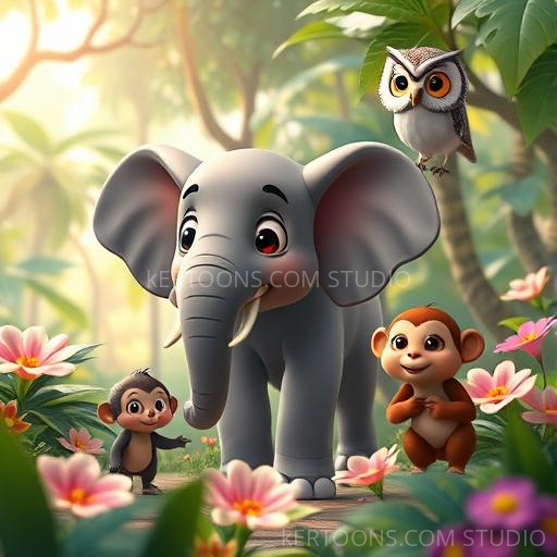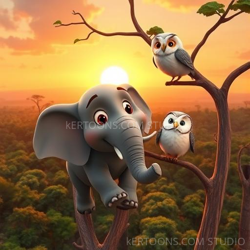Back on the ground, Eka felt a warm glow inside, replacing his anger with gentle happiness. He thanked Mira and the Wise Owl for their kindness. His friends noticed his big smile and saw how he played softly, sharing his joy. Eka learned that being angry wasn’t the only way to solve problems. Now, he chose to stay calm and happy, spreading his new smile to everyone around him. The jungle echoed with laughter and cheerful trumpets, as Eka’s heart filled with kindness and peace, shining brighter than ever.