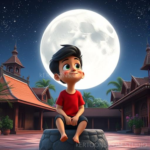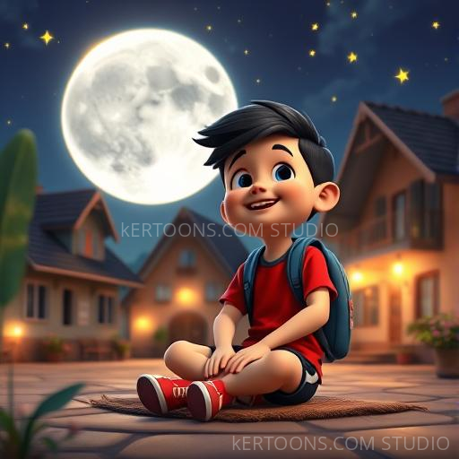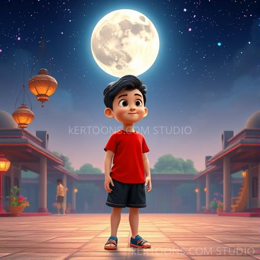 In a cozy Indian village nestled under a blanket of twinkling stars, young Aarav loved gazing at the glowing moon every night. He noticed how the moon seemed to follow him, casting a gentle silver glow on his face. His eyes sparkled with wonder as he wondered why the moon was so interested in him. The night air was filled with the sweet scent of jasmine and the soft chirping of crickets, making the moment magical and serene.