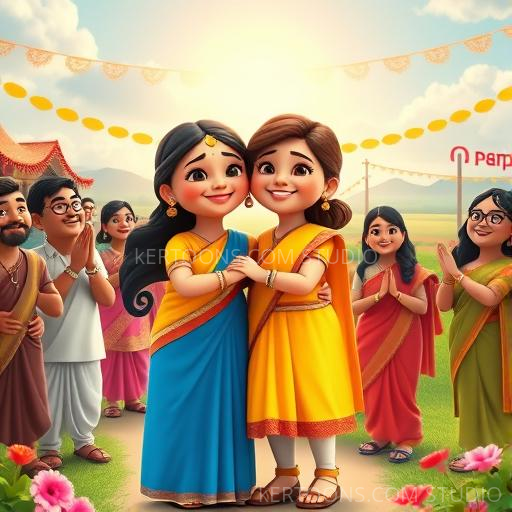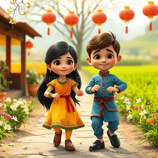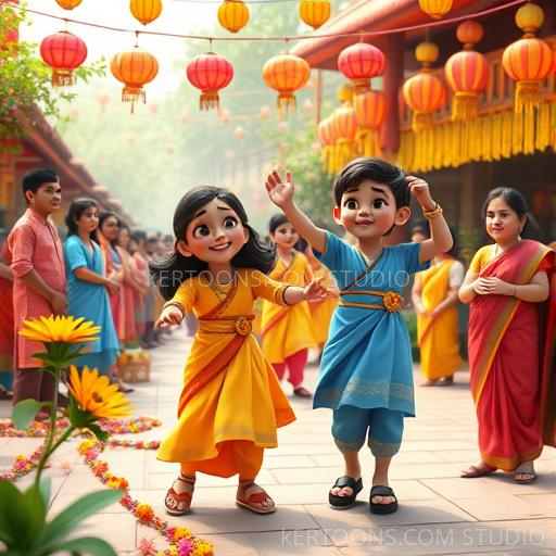 In a vibrant Indian village bursting with colors, flowers bloom in every corner, and lanterns sway gently in the breeze. Baisakhi and Bihu, the joyful twin festivals, are about to begin. The children giggle and dance, their hearts full of excitement, but sometimes they feel shy to dance loudly in front of everyone. Today, the air is filled with the sweet scent of marigolds and jasmine, promising a day of happiness and togetherness.
