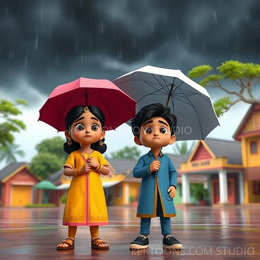 Suddenly, dark storm clouds gather above the village, casting a shadow over the festival preparations. The children look up nervously, worried that the rain will spoil their special day. The wind howls softly, and the first drops begin to fall, making everyone pause with anxious hearts. Despite the fear, the children remember the stories of unity and bravery shared by Grandma Tulsi, feeling a flicker of hope ignite inside them.