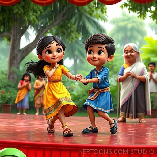 As the rain pours down, Baisakhi and Bihu step onto the stage, holding hands tightly. With bright smiles, they start dancing and singing lively songs about harvest and happiness. Their movements are full of joy and bravery, encouraging everyone to join in despite the rain. The villagers watch in awe as the children’s courage turns the gloomy sky into a celebration of unity and cheerfulness, their voices ringing clear and strong.