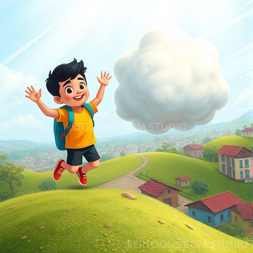 Determined to keep his friend close, Chintu called out to the cloud, waving his arms and jumping with excitement. The cloud playfully danced around him, swirling and twirling, making Chintu laugh and feel a flutter of nervousness. He ran up a small hill, trying to reach the floating friend, feeling the warm breeze and the thrill of adventure.