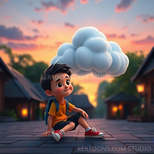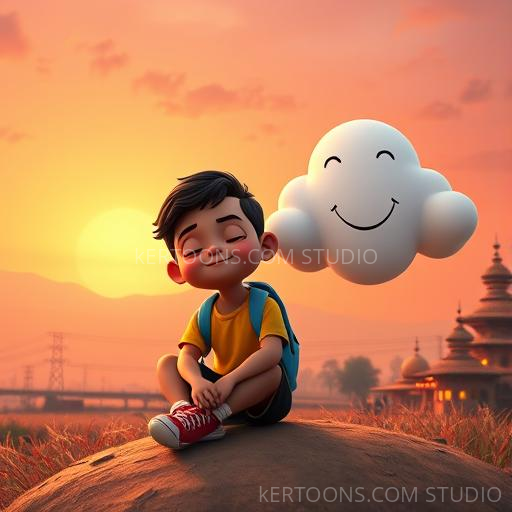 As the sun began to set, casting a warm golden glow, Chintu faced a choice: keep chasing the cloud or stay close and enjoy the moment. With a deep breath, he decided to stay near his new friend, realizing that true friendship is about sharing time and happiness. The cloud gently settled beside him, glowing softly in the evening light.