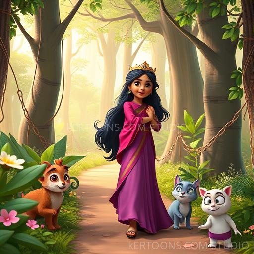 Sana and Ravi set out on their adventure, walking through lush forests and colorful fields. They encounter tricky traps—twisting vines and hidden pits—but Sana’s gentle words soothe the forest creatures, and Ravi’s clever tricks help them escape. Along the way, they realize that greed can blind even the wisest, and that kindness and cleverness are the true treasures of their journey.