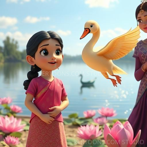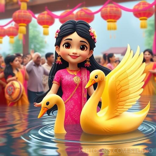 In a vibrant Indian village nestled beside a shimmering lake, young Sana gazes at the water's surface, dreaming of the legendary golden swan that is said to bring endless happiness. The air is filled with the scent of jasmine and marigolds, and colorful festival banners flutter in the gentle spring breeze. Sana's eyes sparkle with hope, believing that magic and kindness can transform her simple world into something extraordinary.