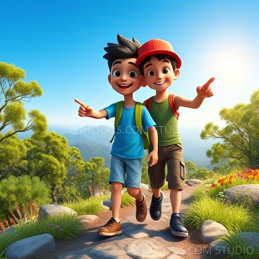 On a radiant summer morning, Suresh and Ramesh eagerly set out from their village, their hearts filled with dreams of reaching the mountain's peak. The air was warm, carrying the sweet scent of blooming jasmine and fresh grass. As they climbed the gentle slopes, the hills shimmered under the golden sun, inviting them to explore their secrets. The friends felt a bubbling excitement, ready for adventure and the promise of a breathtaking view at the top.
