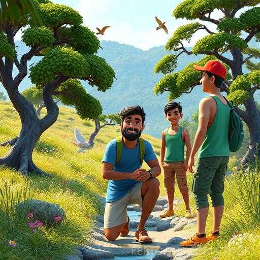 Suddenly, the friends paused, realizing they had wandered off the familiar trail. The path behind them disappeared into a swirl of green, and the towering hills seemed to whisper mysteries. Fear crept into their hearts as they looked around, unsure of which way led home. The bright sky now felt a little distant, and shadows grew longer. Tears welled up, but they held each other's hands, determined to find their way back.