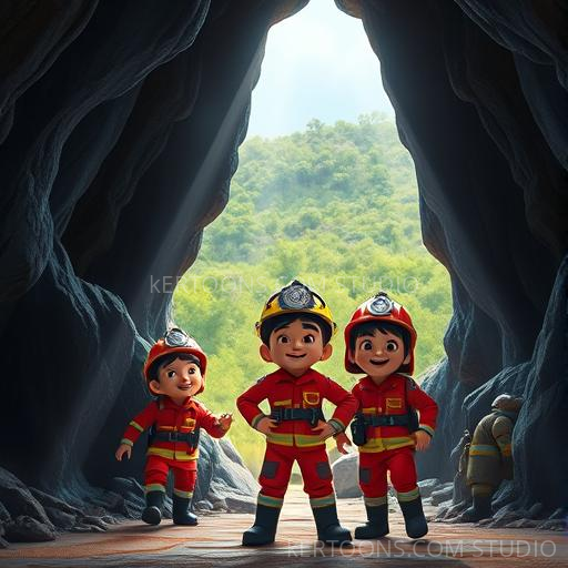 Just as the cave threatened to swallow them forever, bright lights appeared at the entrance. It was the brave fire force team, shining like stars in the dark. The firefighters moved carefully, their helmets gleaming and their tools ready. With gentle courage, they navigated the tricky tunnels and reached Ram and Shyam. The children’s faces lit up with relief and gratitude as they were carefully helped out of the cave, safe and sound. The firefighters smiled warmly, proud of their brave rescue, reminding everyone that help is always nearby.