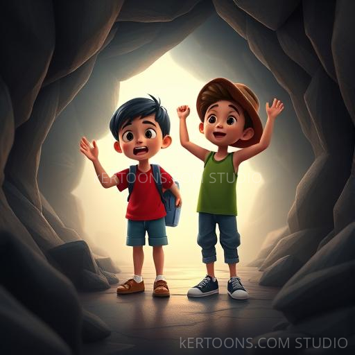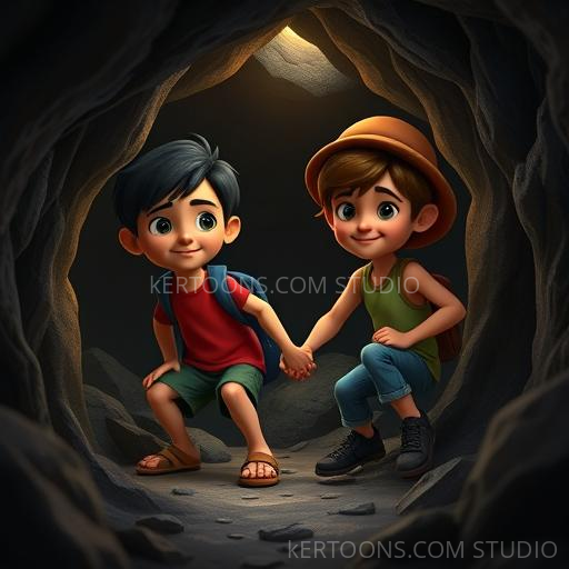 As they tiptoed into the forbidden zone, Ram and Shyam stumbled over a loose stone and accidentally slipped into a dark, mysterious cave. The entrance closed behind them with a soft thud, and suddenly, they found themselves trapped inside, feeling a shiver of fear. Shadows danced on the damp walls, and the boys clung to each other, realizing they needed to stay brave and find a way out.