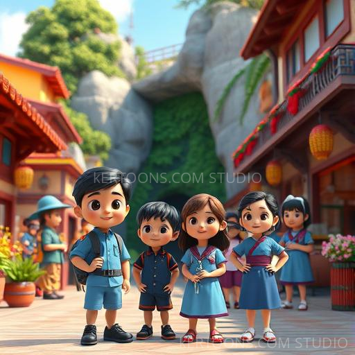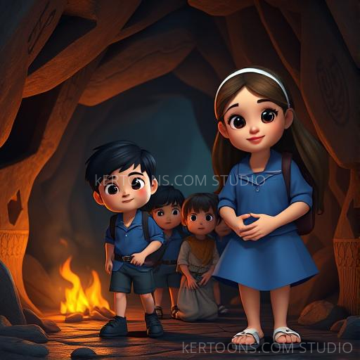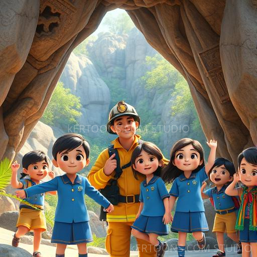 In a vibrant Indian village nestled between lush green fields and shimmering rivers, Ramu and Sita eagerly joined their classmates on a school tour to explore the mysterious cave. The air was filled with excitement and the scent of jasmine, as everyone wondered about the secrets hidden inside. Ramu’s eyes sparkled with curiosity, imagining what wonders the dark depths might hold, feeling a mix of thrill and nervousness in his little heart.