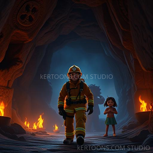 With the firefighter leading the way, Ramu and Sita bravely stepped into the smoky tunnel. Ramu’s heart pounded, but he kept his eyes on the shining helmet of the firefighter. Together, they navigated past flickering flames and jagged rocks, calling out to the trapped children. Slowly but surely, everyone made their way out into the bright sunlight, their faces lit with relief and joy. The cave was safe again, and the children cheered for the hero who had saved them all, including Ramu and Sita, who felt proud of their courage.